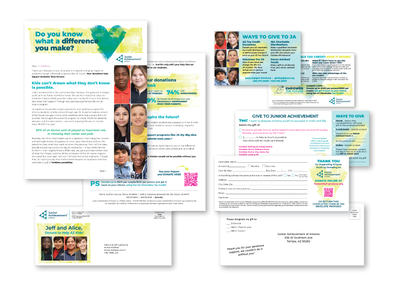 At Pixa, there is a special place in our heart for Junior Achievement of Arizona. We love helping JA maximize donations by dialing up the personalization in their annual appeal and sharing their impact across channels. Their multi-piece mailing is packed with variable data and tailored messaging.